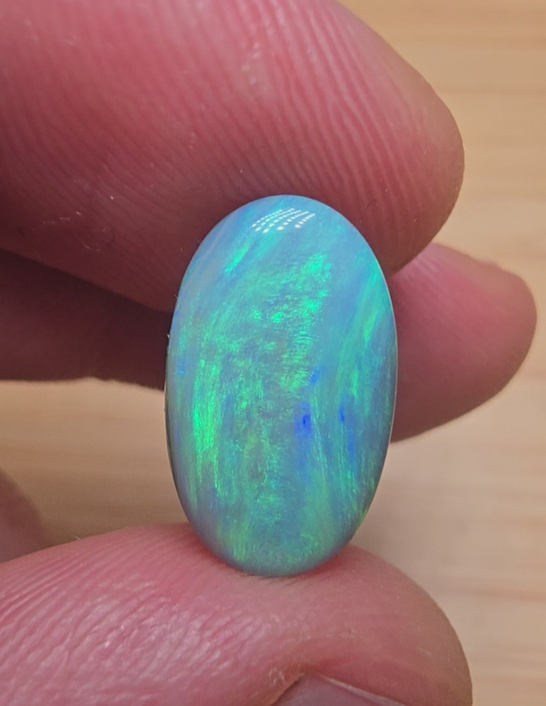 A large, beautiful and bold dark Lightning Ridge opal that displays strong blue layered colour play. Holds its colour in any lighting and displays flahses of green and blue colour overlay. featured in one of our Instagram cutting videos. This opal is a special one.
