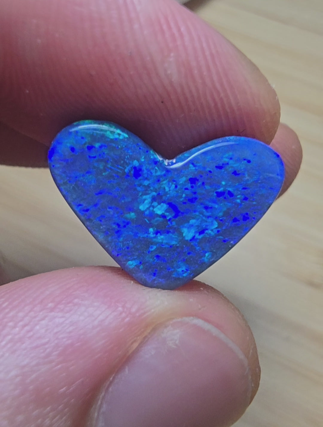 An amazing and special piece. Large black opal cut into a heart shape displaying strong blue colour play with layered purple patterning runnning through it aswell. Holds its colour in minimal lighting. Perfect pendant piece for a special someone.
