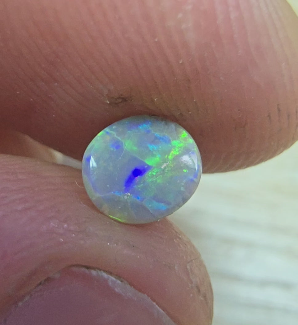 A brilliant and bright dark opal, displays bright large chunks of flagstone pattern. Green and orange colour play.