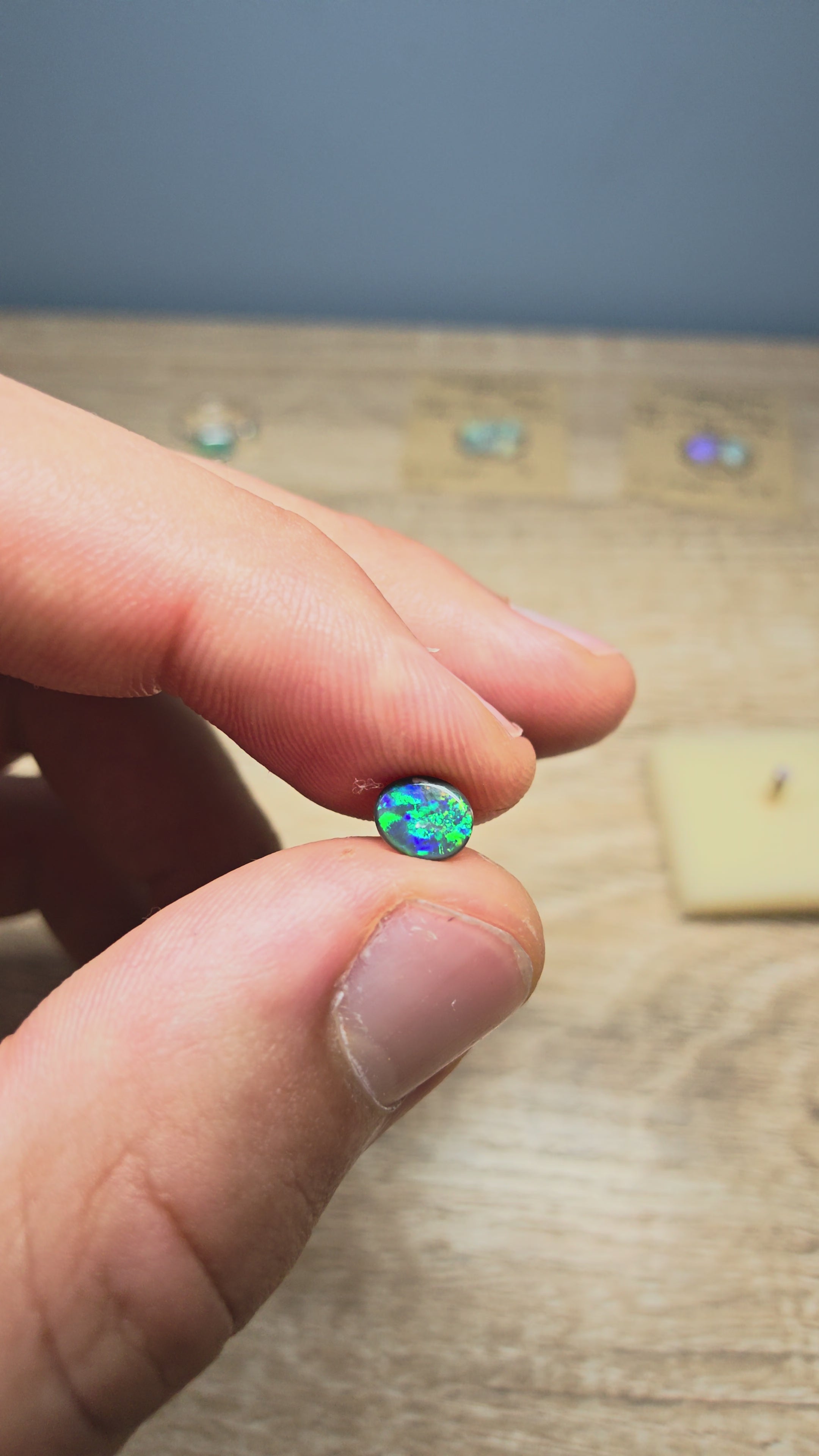 A perfect, bright and affordable black opal ring stone. Displays nice strong green and blue colour play with little hints of gold. Made much more affordable by some very slight inclusions in its face that reduce its value but do not in any way impinge on its colour display or beauty.