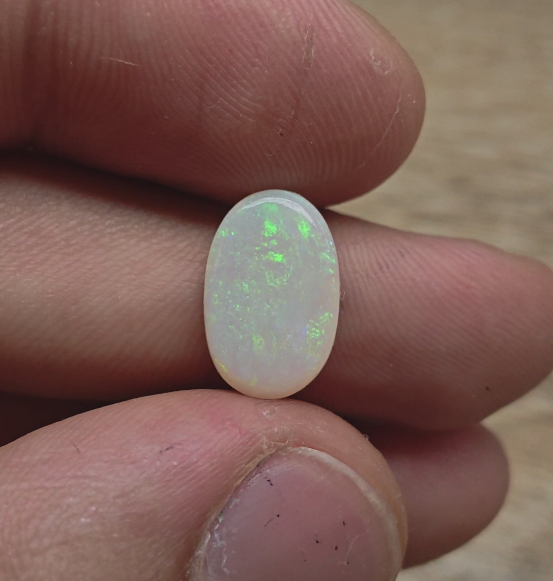 A lovely and soft broad faced white opal, displays soft green moss pattern colour play that rolls across its face.