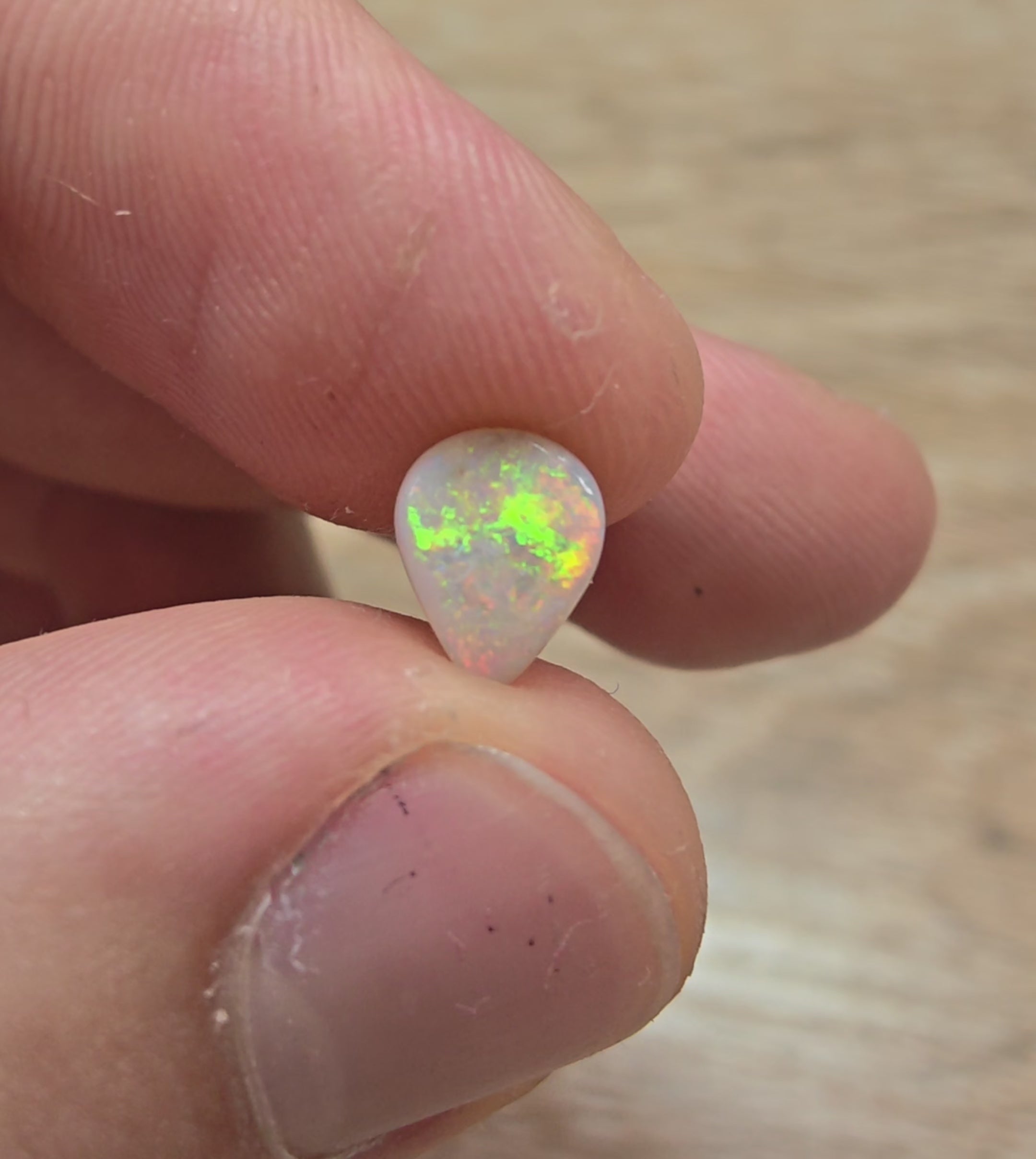 A beautiful drop cut white opal, displays bright and directional red and green colour play. Would make a great affordable ring stone.