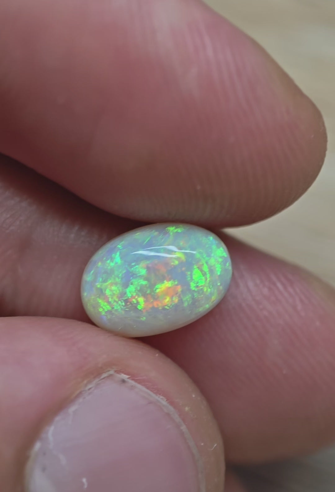 A high domed dark crystal opal, cut with a nice high dome. Displays a full face of bright green colour with flashes of orange colour from certain directions.