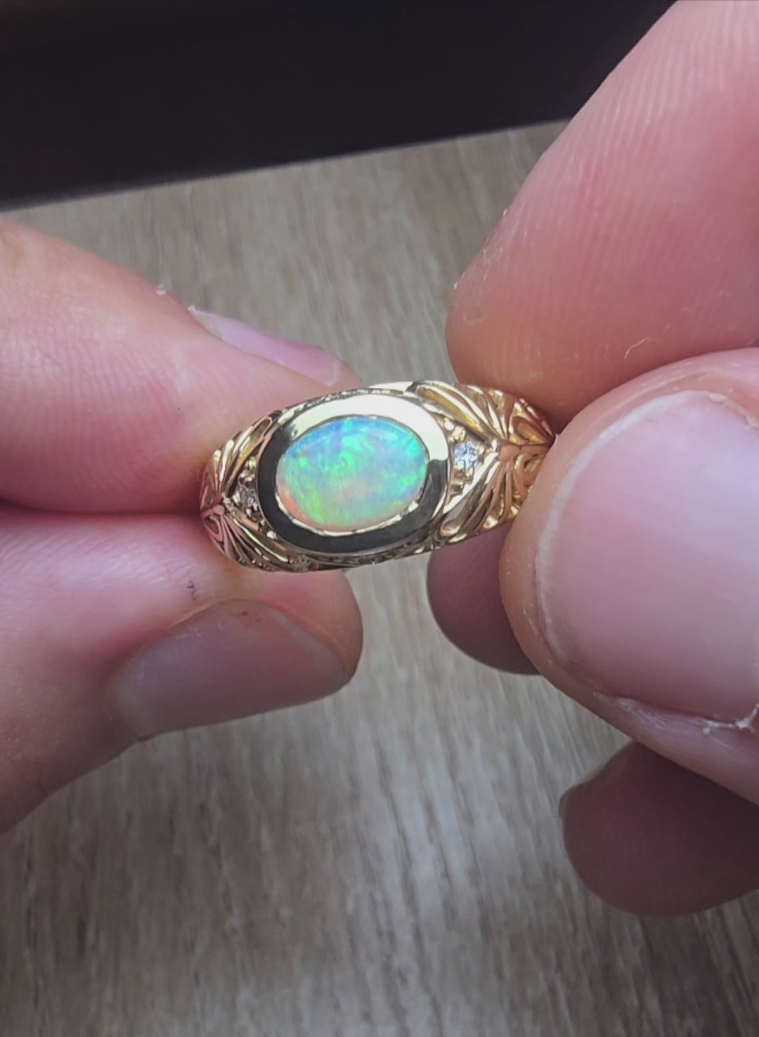 A stunning 18k solid gold signet ring featuring a Cooper Pedy crystal opal as the centre stone and 4 vivid natural white diamonds set on the shoulders. This ring also has a phenmonenal hand carved filigree pattern around the centre stone.