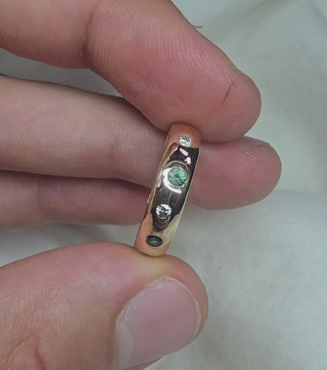 This piece was a project in of itself to create and complete and the second of what will be many one of kind solid gold custom jewellery pieces to be made by me. It is of note that the sapphires used in this ring are geniune and australian however are also a little worn, this wear is visible on some of the facets of the sapphires.