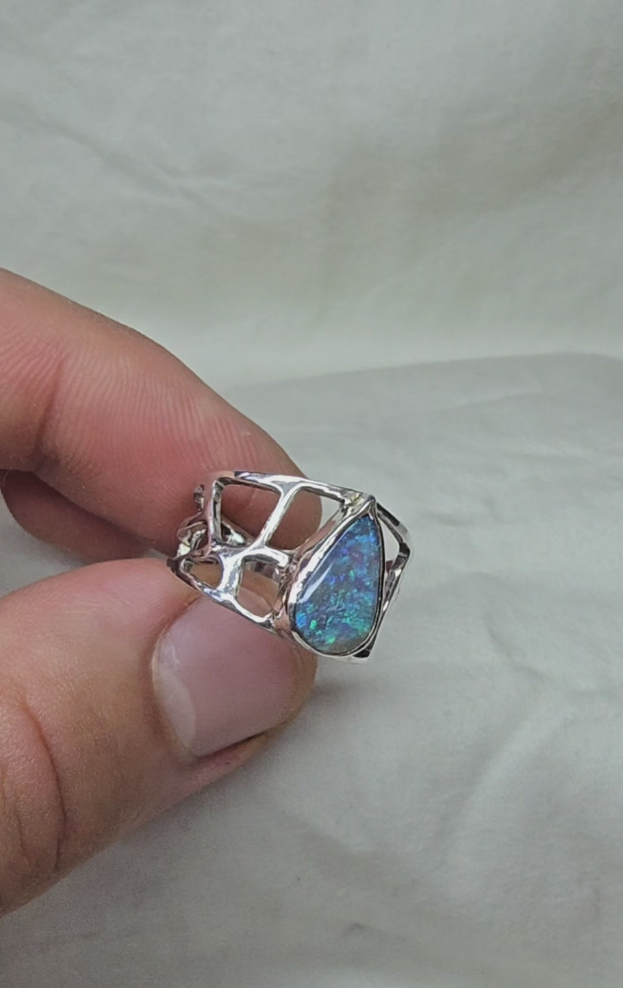 A beautiful cut out cigar band filled with free form shapes and a stunning centre piece Australian crystal opal displays beautiful sparkles of blue and purple colour play. Perfect as an affordable statement piece or everyday wear.